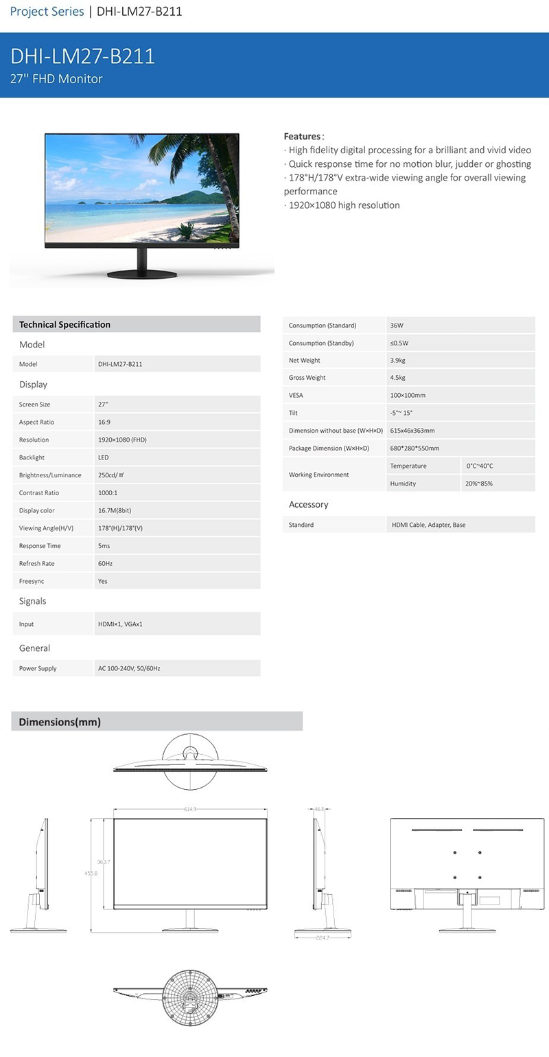 DAHUA LM27-B211 27" (16:9) FHD IPS LED 1920x1080, 5MS, D-SUB, HDMI, 60Hz, 3YR MONDHLM27B211