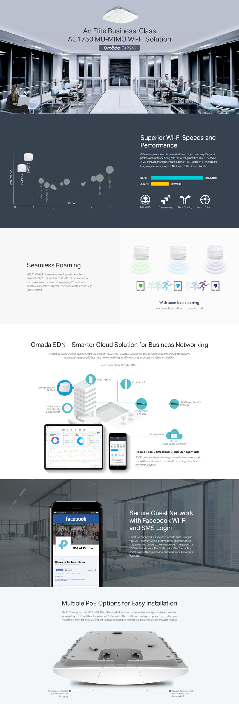 | Package Contents | • AC1750 Wireless MU-MIMO Gigabit Ceiling Mount Access Point EAP245 • Gigabit Passive PoE Adapter (PoE Adapter not include) • Mounting Kits • Installation Guide |