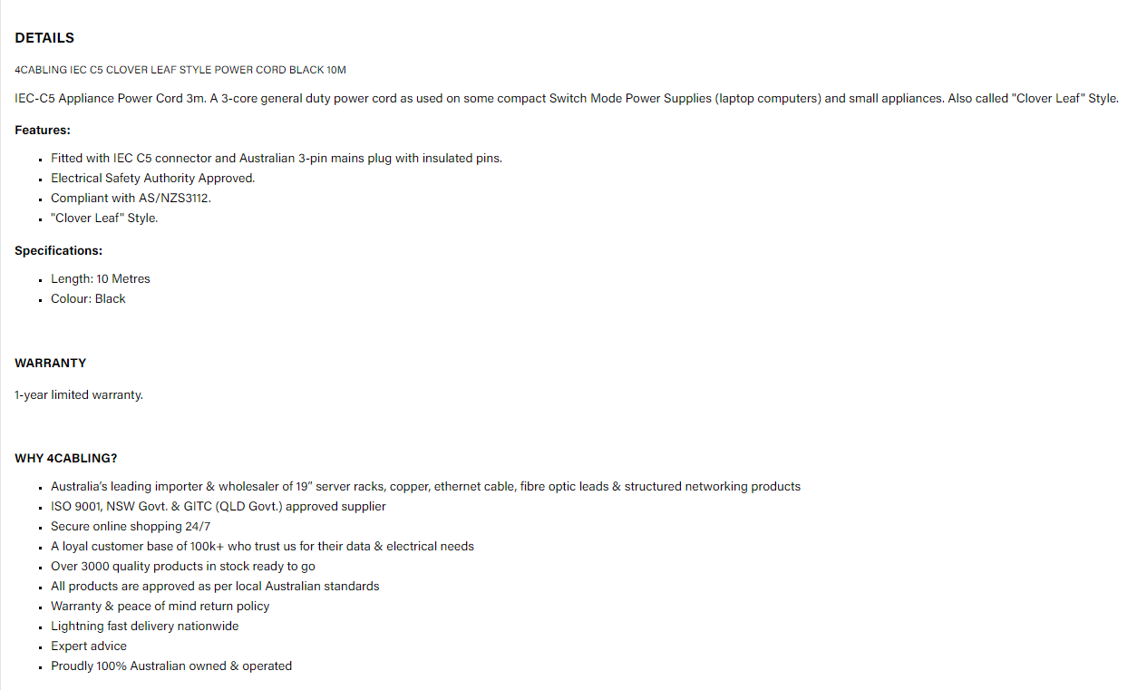 4Cabling IEC C5 Clover Leaf Style Power Cord Black 10M IEC-C5 Appliance Power Cord 3m. A 3-core general duty power cord as used on some compact Switch Mode Power Supplies (laptop computers) and small appliances. Also called ''Clover Leaf'' Style. Features: Fitted with IEC C5 connector and Australian 3-pin mains plug with insulated pins. Electrical Safety Authority Approved. Compliant with AS/NZS3112. ''Clover Leaf'' Style. Specifications: Length: 10 Metres Colour: Black  WARRANTY 1-year limited warranty.  WHY 4CABLING? Australiaâs leading importer & wholesaler of 19â server racks, copper, ethernet cable, fibre optic leads & structured networking products ISO 9001, NSW Govt. & GITC (QLD Govt.) approved supplier Secure online shopping 24/7 A loyal customer base of 100k+ who trust us for their data & electrical needs Over 3000 quality products in stock ready to go All products are approved as per local Australian standards Warranty & peace of mind return policy Lightning fast delivery nationwide Expert advice Proudly 100% Australian owned & operated Â