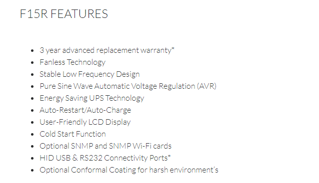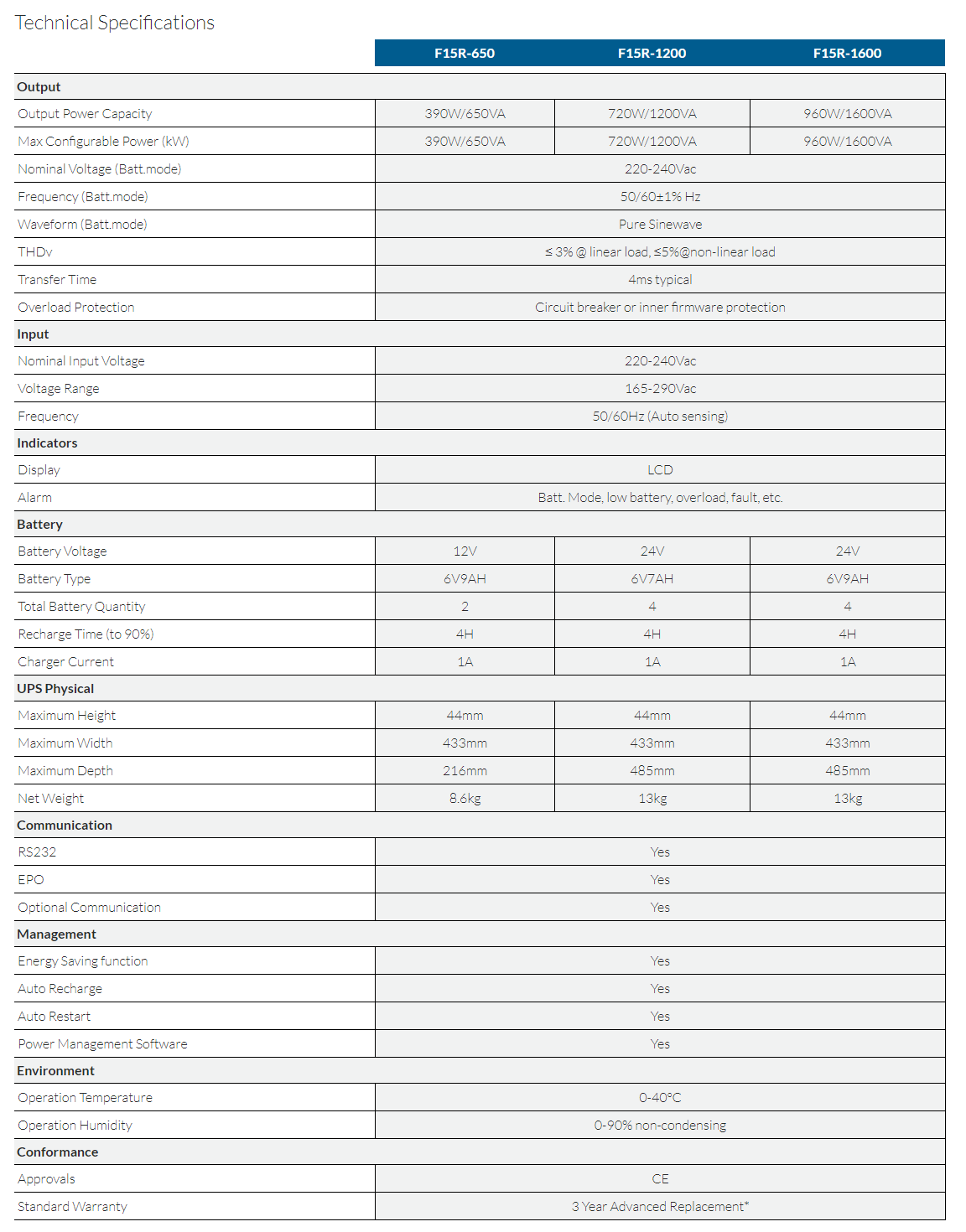 ION F15R line interactive pure sinewave 1RU rack / tower UPS has been designed for high power density protection in a compact footprint. Ranging from 650VA, 1200VA & 1600VA the F15R comes with the option for network management cards as well as Wi-Fi. The F15R UPS also has a LCD user interface to simplify monitoring. The F15R range is the perfect way to flexibly integrate reliable power supply and protection for security products, servers, switches, routers storage devices and short depth rack applications exposed to potential data loss, corruption and downtime.