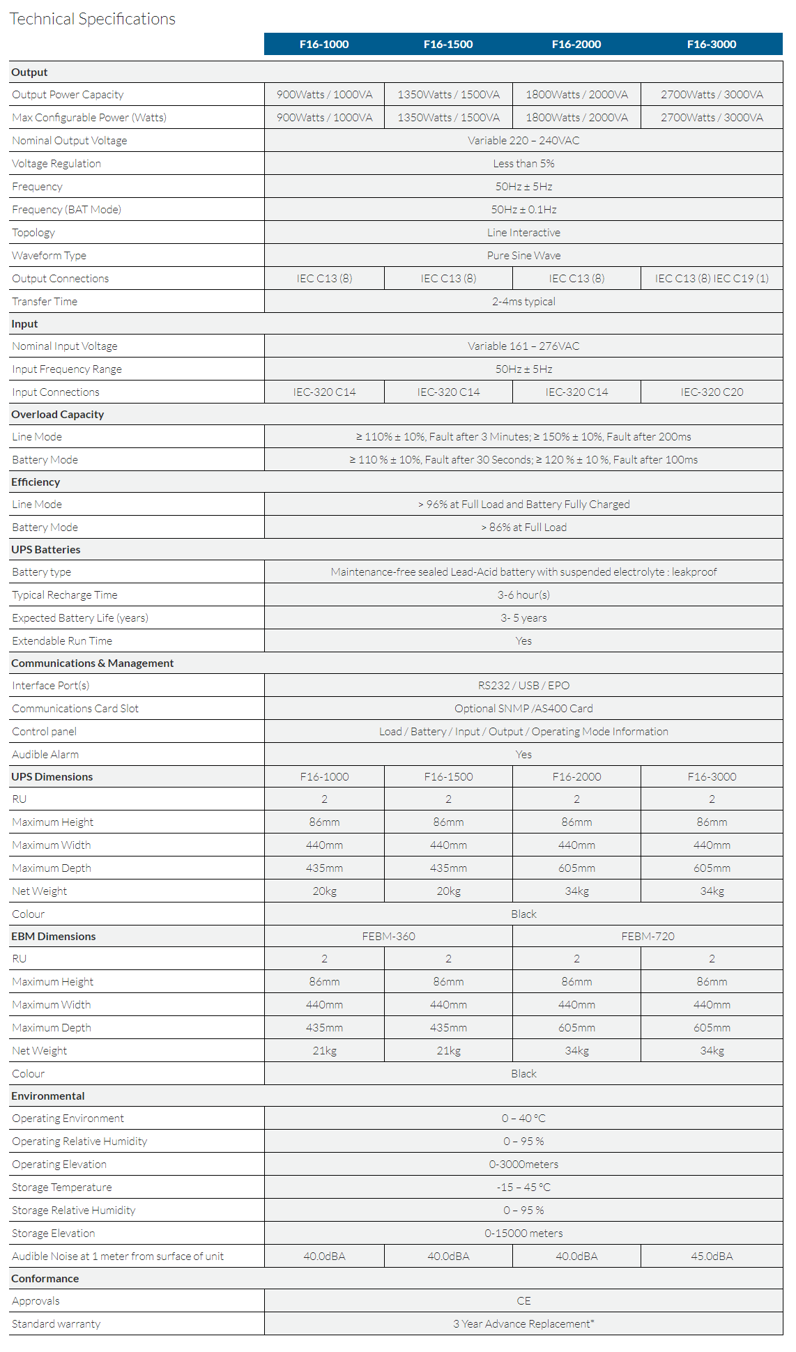 The ION F16 Rack/Tower UPS provides line-interactive backup, high power factor power and scalable runtimes for servers, storage systems, VoIP gear and network equipment. With an intuitive LCD display, outlet groups, and high efficiency, the F16 is the affordable way for businesses to flexibly integrate reliable power backup and protect vital IT and Telecom equipment.