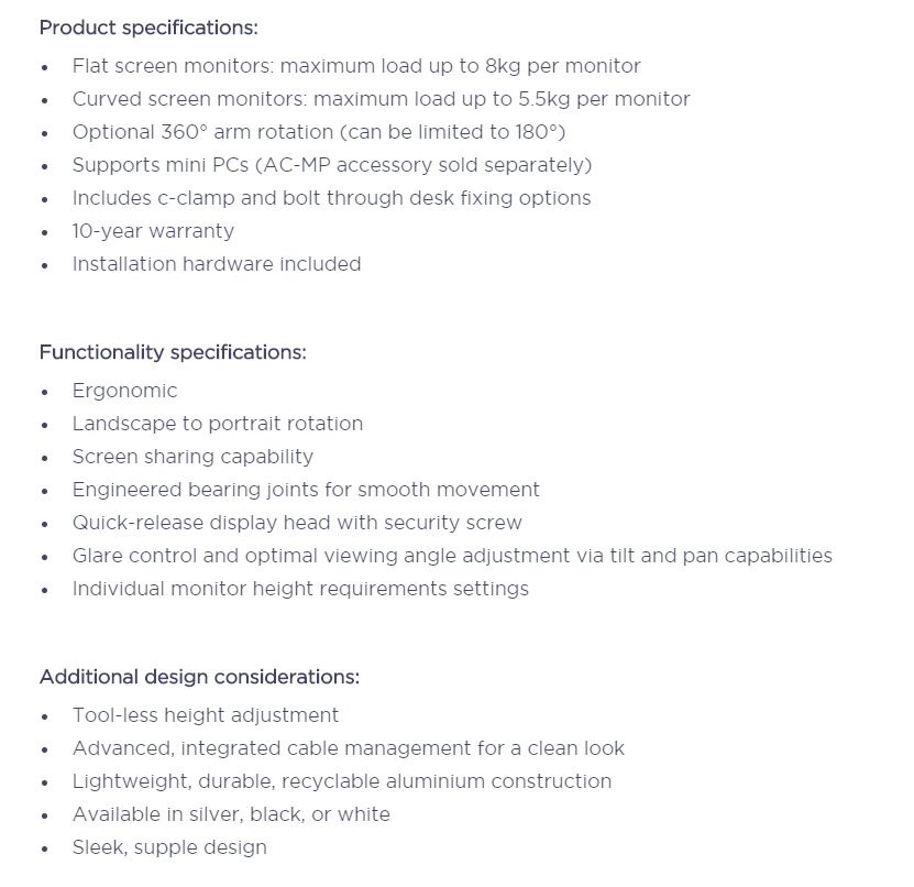 The AFS-AT-DC is designed to support two displays up to 8kg. This desk mount is featuring a 525mm pole with two articulated display arms. The arms can be independently set to the desired height to ensure perfect display alignment be it identical or different size monitors. Easy glare control and focal distance adjustments are possible thanks to three points of articulation on each arm, tilt and pan functions. The rotating function at the VESA head allows applications in either landscape or portrait orientation. The displays can be set in a back-to-back or side-by-side configuration (up to 27" monitors in a side-by-side landscape orientation). Generous cable management completes the sleek and professional look.