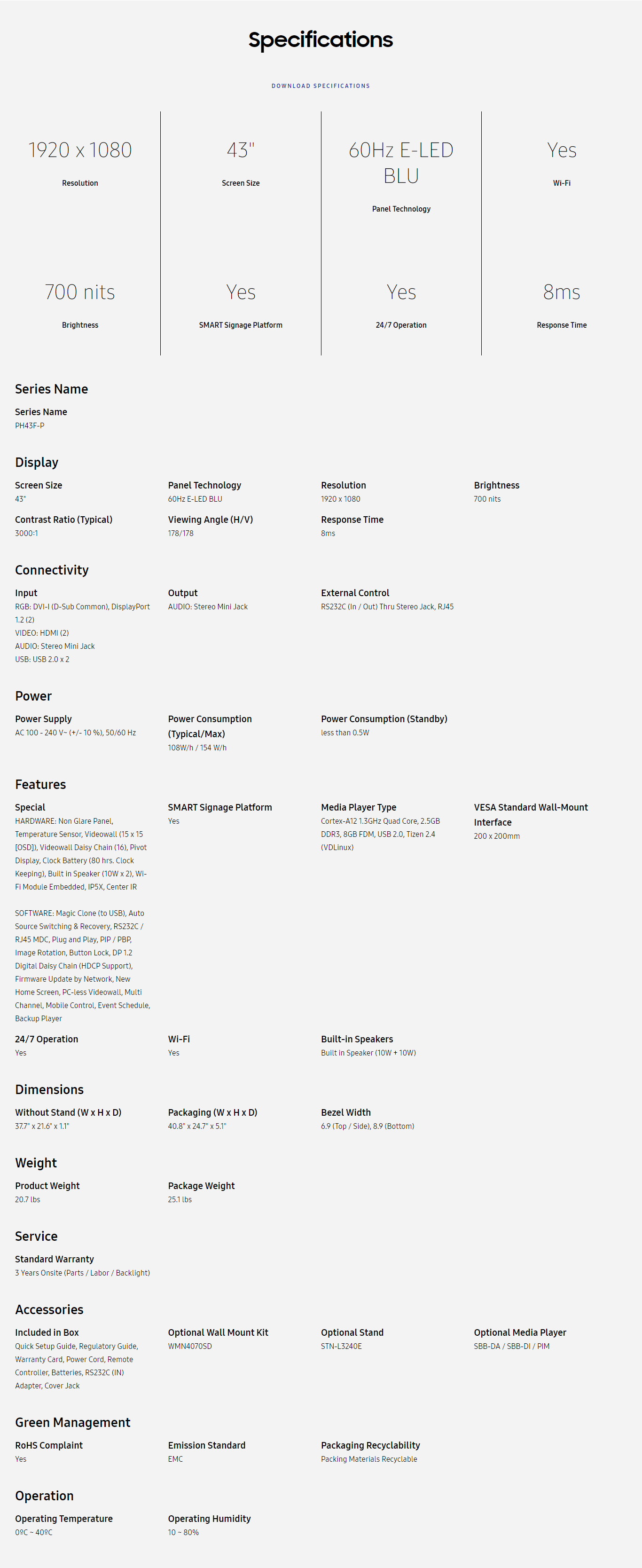 43In Dc Series 1920 X 1080 300Nit 16Hrslh43Dcjplgc/Xy