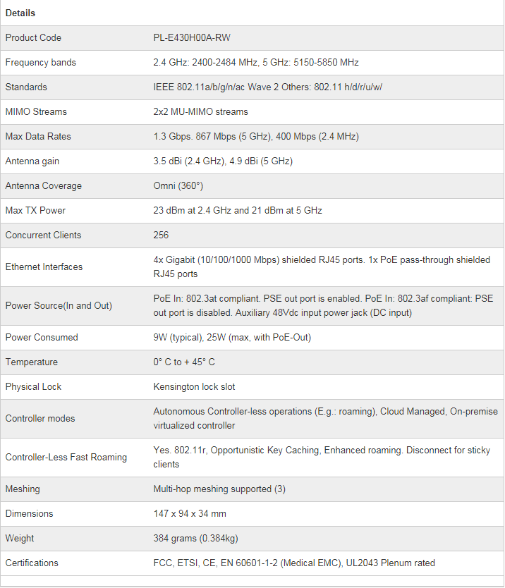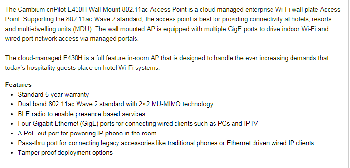 Cambium E430H Indoor (Row) 802.11Ac Wave 2 2X2 Wall Plate Wlan Ap With Single Gang Wall Bracket Pl-E430H00A-Rw