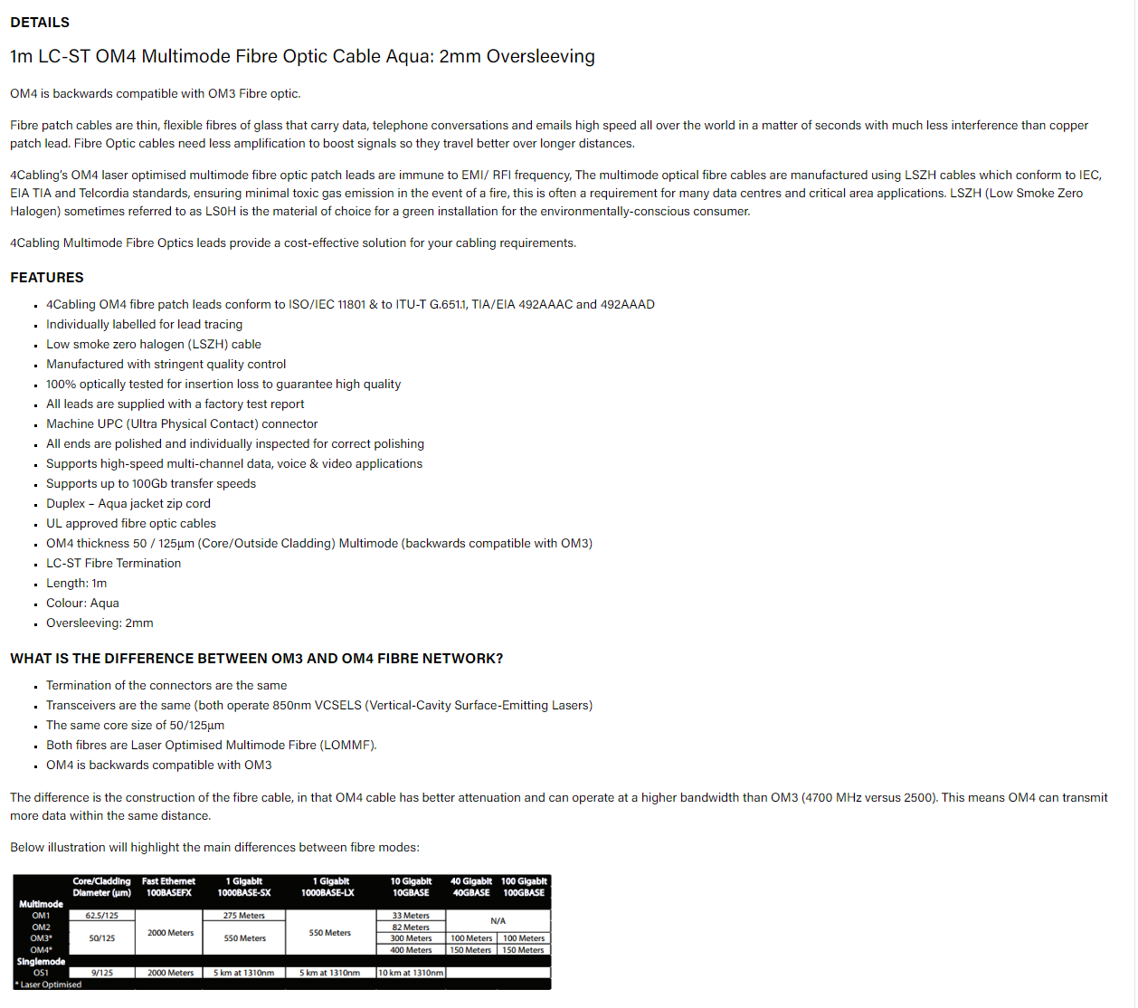 1m LC-ST OM4 Multimode Fibre Optic Cable Aqua: 2mm Oversleeving OM4 is backwards compatible with OM3 Fibre optic. Fibre patch cables are thin, flexible fibres of glass that carry data, telephone conversations and emails high speed all over the world in a matter of seconds with much less interference than copper patch lead. Fibre Optic cables need less amplification to boost signals so they travel better over longer distances. 4Cablingâs OM4 laser optimised multimode fibre optic patch leads are immune to EMI/ RFI frequency, The multimode optical fibre cables are manufactured using LSZH cables which conform to IEC, EIA TIA and Telcordia standards, ensuring minimal toxic gas emission in the event of a fire, this is often a requirement for many data centres and critical area applications. LSZH (Low Smoke Zero Halogen) sometimes referred to as LS0H is the material of choice for a green installation for the environmentally-conscious consumer. 4Cabling Multimode Fibre Optics leads provide a cost-effective solution for your cabling requirements. Features 4Cabling OM4 fibre patch leads conform to ISO/IEC 11801 & to ITU-T G.651.1, TIA/EIA 492AAAC and 492AAAD Individually labelled for lead tracing Low smoke zero halogen (LSZH) cable Manufactured with stringent quality control 100% optically tested for insertion loss to guarantee high quality All leads are supplied with a factory test report Machine UPC (Ultra Physical Contact) connector All ends are polished and individually inspected for correct polishing Supports high-speed multi-channel data, voice & video applications Supports up to 100Gb transfer speeds Duplex â Aqua jacket zip cord UL approved fibre optic cables OM4 thickness 50 / 125μm (Core/Outside Cladding) Multimode (backwards compatible with OM3) LC-ST Fibre Termination Length: 1m Colour: Aqua Oversleeving: 2mm What is the difference between OM3 and OM4 fibre network? Termination of the connectors are the same Transceivers are the same (both operate 850nm VCSELS (Vertical-Cavity Surface-Emitting Lasers) The same core size of 50/125μm Both fibres are Laser Optimised Multimode Fibre (LOMMF). OM4 is backwards compatible with OM3 The difference is the construction of the fibre cable, in that OM4 cable has better attenuation and can operate at a higher bandwidth than OM3 (4700 MHz versus 2500). This means OM4 can transmit more data within the same distance. Below illustration will highlight the main differences between fibre modes: Warranty 3-year limited warranty. Why 4Cabling? Australiaâs leading importer & wholesaler of 19â server racks, copper, ethernet cable, fibre optic leads & structured networking products ISO 9001, NSW Govt. & GITC (QLD Govt.) approved supplier Secure online shopping 24/7 A loyal customer base of 100k+ who trust us for their data & electrical needs Over 3000 quality products in stock ready to go All products are approved as per local Australian standards Warranty & peace of mind return policy Lightning-fast delivery nationwide Expert advice Proudly 100% Australian owned & operated