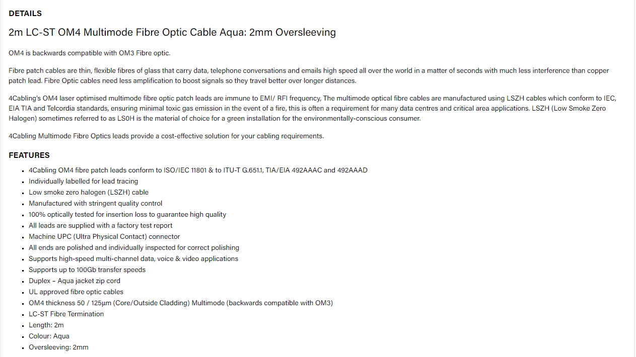 2m LC-ST OM4 Multimode Fibre Optic Cable Aqua: 2mm Oversleeving OM4 is backwards compatible with OM3 Fibre optic. Fibre patch cables are thin, flexible fibres of glass that carry data, telephone conversations and emails high speed all over the world in a matter of seconds with much less interference than copper patch lead. Fibre Optic cables need less amplification to boost signals so they travel better over longer distances. 4Cablingâs OM4 laser optimised multimode fibre optic patch leads are immune to EMI/ RFI frequency, The multimode optical fibre cables are manufactured using LSZH cables which conform to IEC, EIA TIA and Telcordia standards, ensuring minimal toxic gas emission in the event of a fire, this is often a requirement for many data centres and critical area applications. LSZH (Low Smoke Zero Halogen) sometimes referred to as LS0H is the material of choice for a green installation for the environmentally-conscious consumer. 4Cabling Multimode Fibre Optics leads provide a cost-effective solution for your cabling requirements. Features 4Cabling OM4 fibre patch leads conform to ISO/IEC 11801 & to ITU-T G.651.1, TIA/EIA 492AAAC and 492AAAD Individually labelled for lead tracing Low smoke zero halogen (LSZH) cable Manufactured with stringent quality control 100% optically tested for insertion loss to guarantee high quality All leads are supplied with a factory test report Machine UPC (Ultra Physical Contact) connector All ends are polished and individually inspected for correct polishing Supports high-speed multi-channel data, voice & video applications Supports up to 100Gb transfer speeds Duplex â Aqua jacket zip cord UL approved fibre optic cables OM4 thickness 50 / 125μm (Core/Outside Cladding) Multimode (backwards compatible with OM3) LC-ST Fibre Termination Length: 2m Colour: Aqua Oversleeving: 2mm What is the difference between OM3 and OM4 fibre network? Termination of the connectors are the same Transceivers are the same (both operate 850nm VCSELS (Vertical-Cavity Surface-Emitting Lasers) The same core size of 50/125μm Both fibres are Laser Optimised Multimode Fibre (LOMMF). OM4 is backwards compatible with OM3 The difference is the construction of the fibre cable, in that OM4 cable has better attenuation and can operate at a higher bandwidth than OM3 (4700 MHz versus 2500). This means OM4 can transmit more data within the same distance. Below illustration will highlight the main differences between fibre modes: Warranty 3-year limited warranty. Why 4Cabling? Australiaâs leading importer & wholesaler of 19â server racks, copper, ethernet cable, fibre optic leads & structured networking products ISO 9001, NSW Govt. & GITC (QLD Govt.) approved supplier Secure online shopping 24/7 A loyal customer base of 100k+ who trust us for their data & electrical needs Over 3000 quality products in stock ready to go All products are approved as per local Australian standards Warranty & peace of mind return policy Lightning-fast delivery nationwide Expert advice Proudly 100% Australian owned & operated