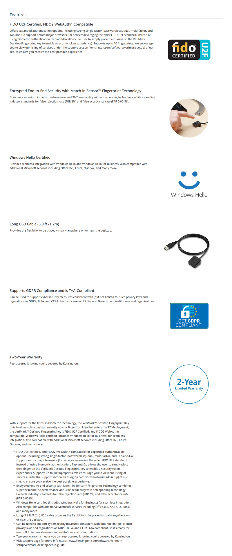 | Other Features | * Encrypted End-to-End Security with Match-in-Sensor Fingerprint Technology * Supports GDPR Compliance and is TAA-Compliant * FIDO U2F Certified, FIDO2 WebAuthn Compatible |