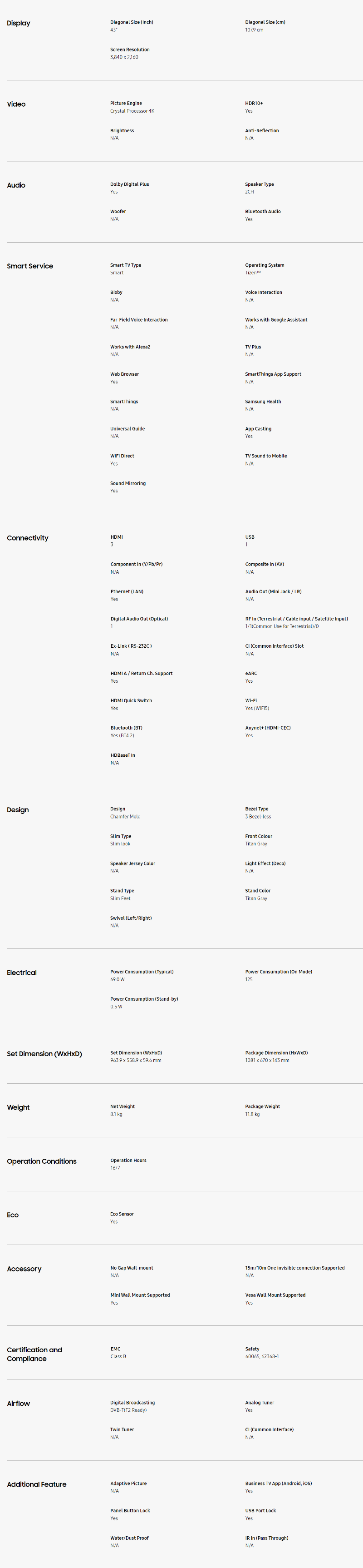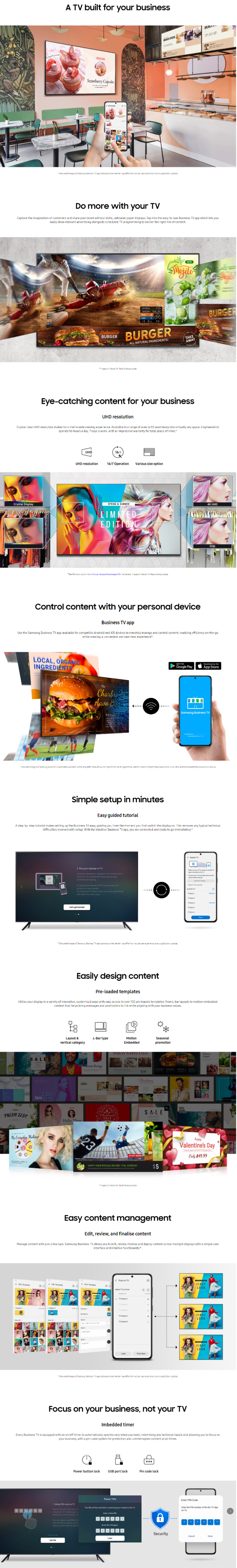 Samsung 43in UHD 16/7 BUSINESS TV 250 NITS HDR10+ 3X HDMI 1X USB HDCP2.2 1X RF TUNER AUDIO OUT WIFI LAN BUILT IN SPEAKERS LANDSCAPE ONLY (LH43BEAHLGWXXY)