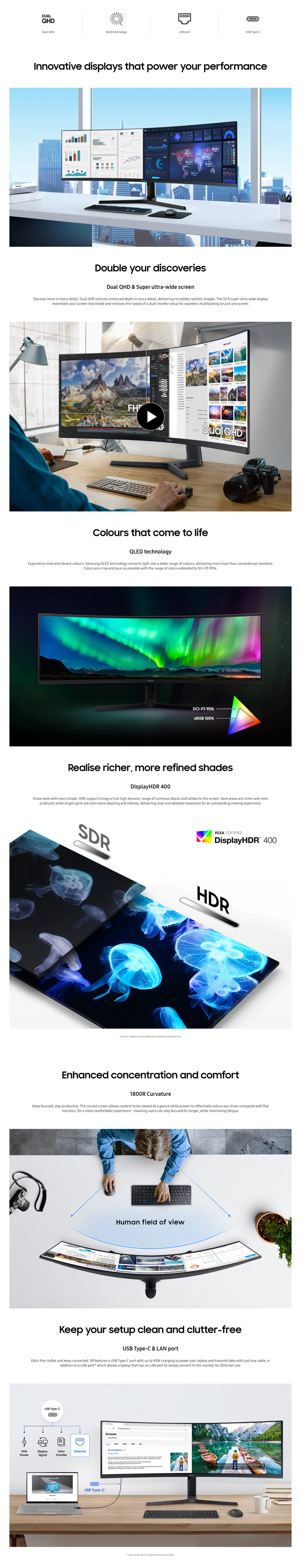 1.07B / 350 NITS / HDR400 / 2XHDMI 2.0 1XDP1.4 1XUSB-C 90W USB HUB 3.0X3 / LAN / HAS / VESA LS49A950UIEXXY