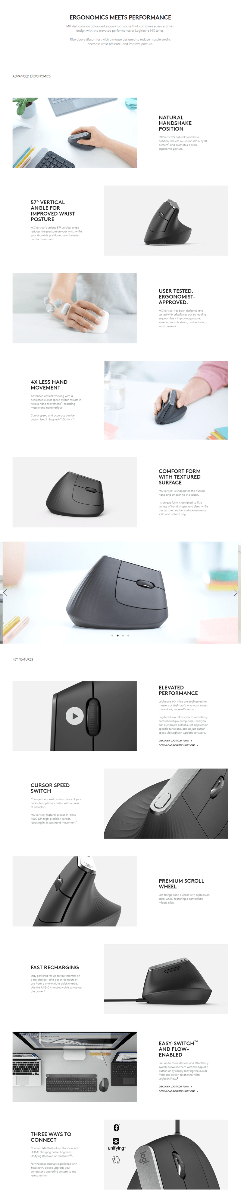 Logitech Mx Vertical Ergonomics Elevated Next-Level Comfort With Mx Vertical Advanced Ergonomic Mouse 910-005449