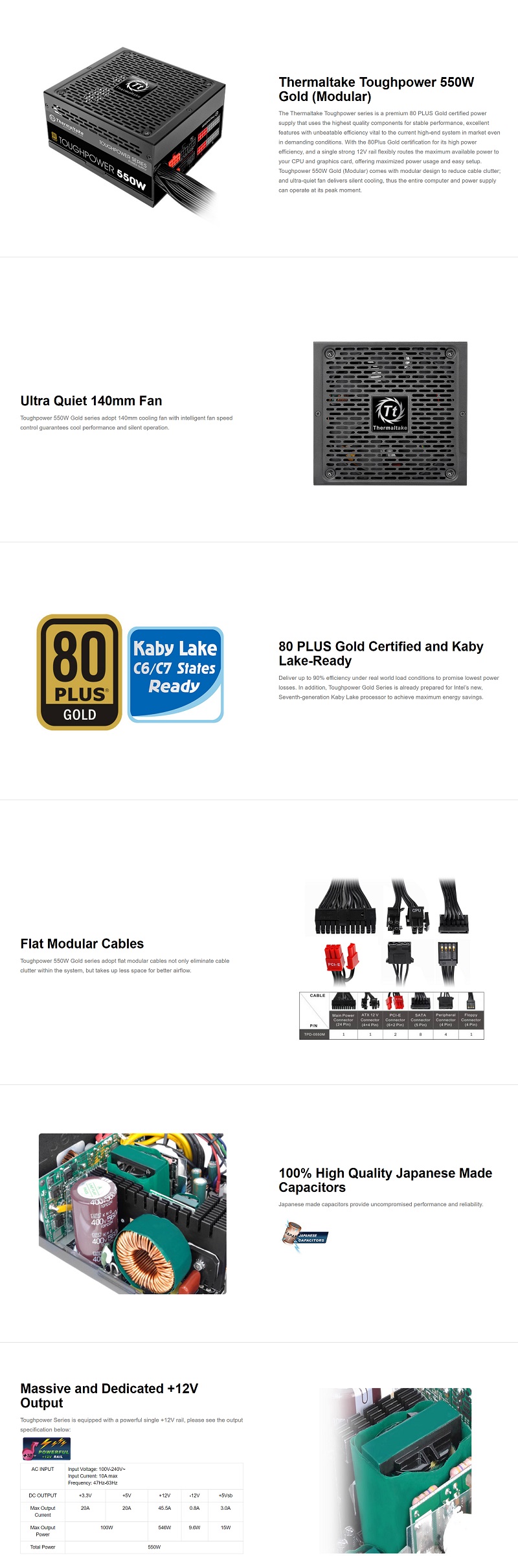ATX PSU: 550W Toughpower 80+ Gold Semi-Modular, 2x PCI-E 6+2Pin, 8x SATA