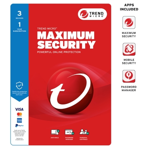 Trend Micro Maximum Security - 3 Device - 1 Year Subscription - Auto Renewal - For Individual Resale - Ransomware Protection - Pay Guard - System Optimizer - Social Media Protection - Secures Mobile Devices - Password Manager - Dark Web Monitoring - P TIC