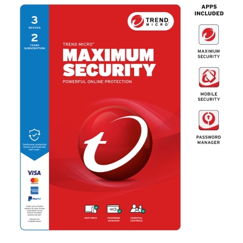 Trend Micro Maximum Security - 3 Device - 2 Year Subscription - Auto Renewal - For Individual Resale - Ransomware Protection - Pay Guard - System Optimizer - Social Media Protection - Secures Mobile Devices - Password Manager - Dark Web Monitoring - P TIC