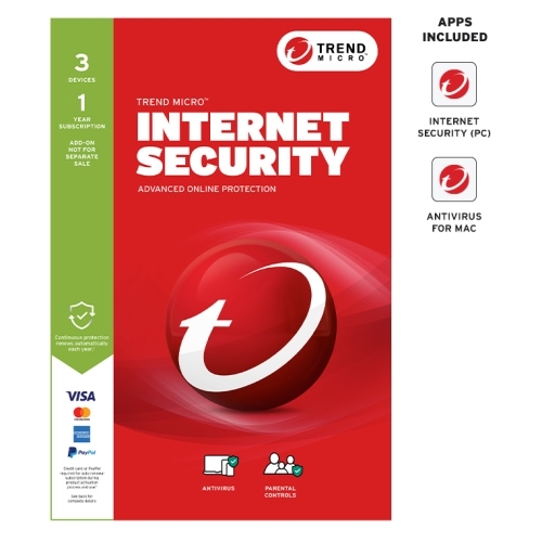 Trend Micro Internet Security - 3 Device - 1 Year Subscription - Mac & PC - Add On - Not For Individual Resale - Ransomware Protection - Pay Guard - System Optimizer - Social Media Protection TICIWWMFXSBXEO